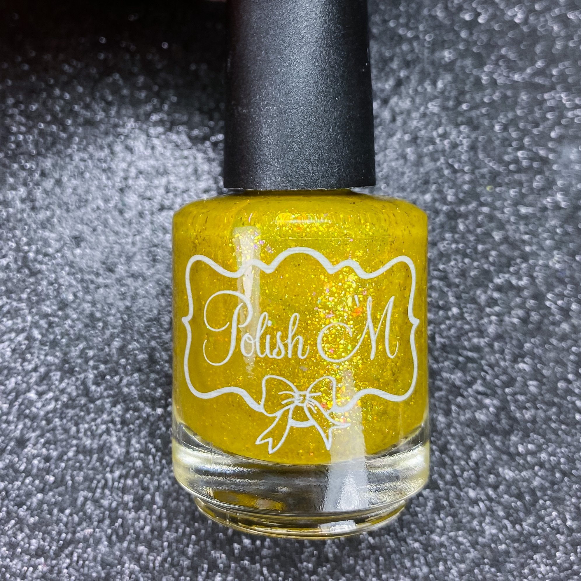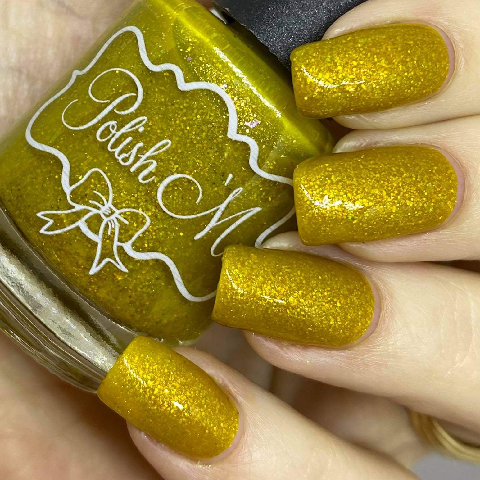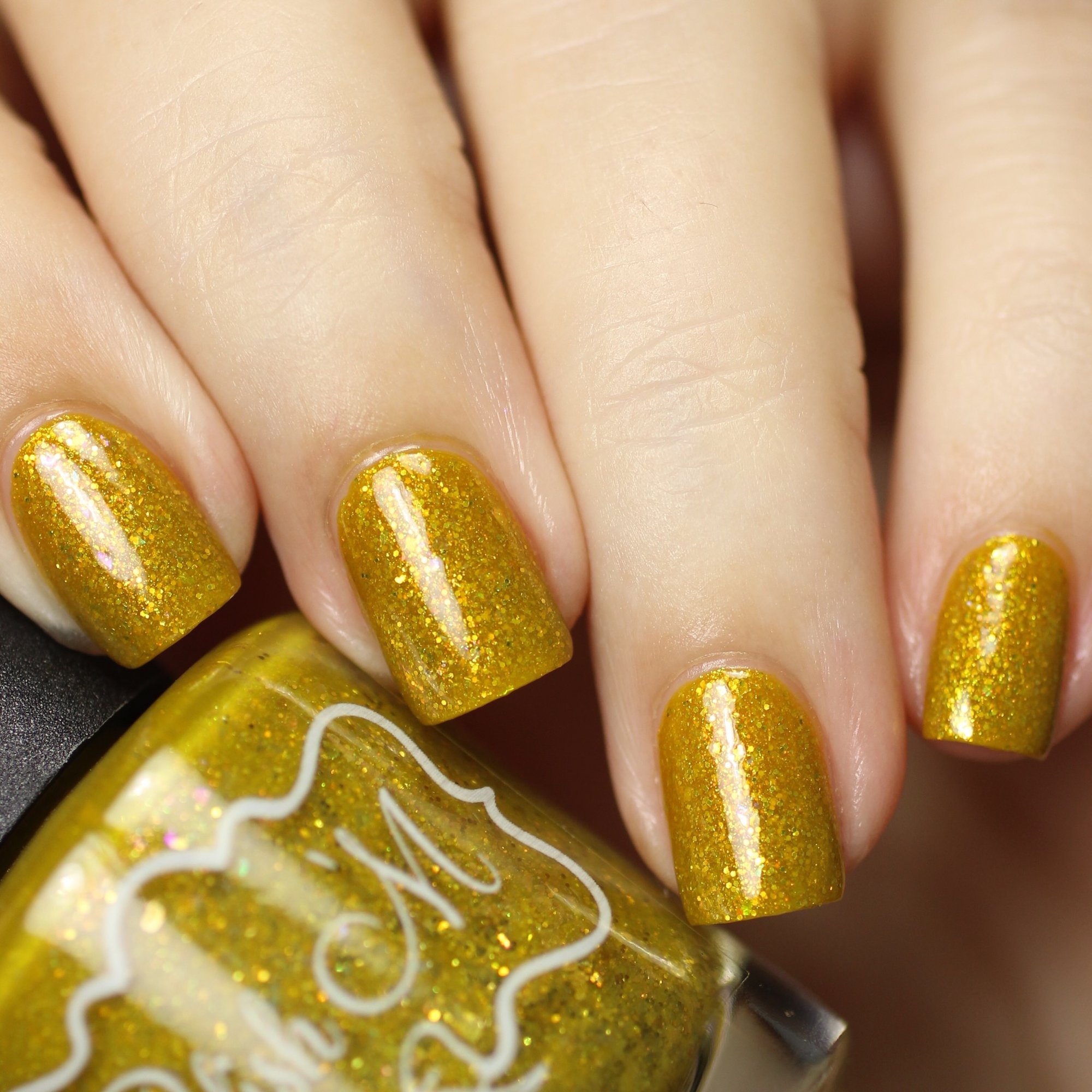 Lost In This Maize - A darkened mustard yellow with gold micro flakes, gold metallic micro glitter and color shifting iridescent flakes.